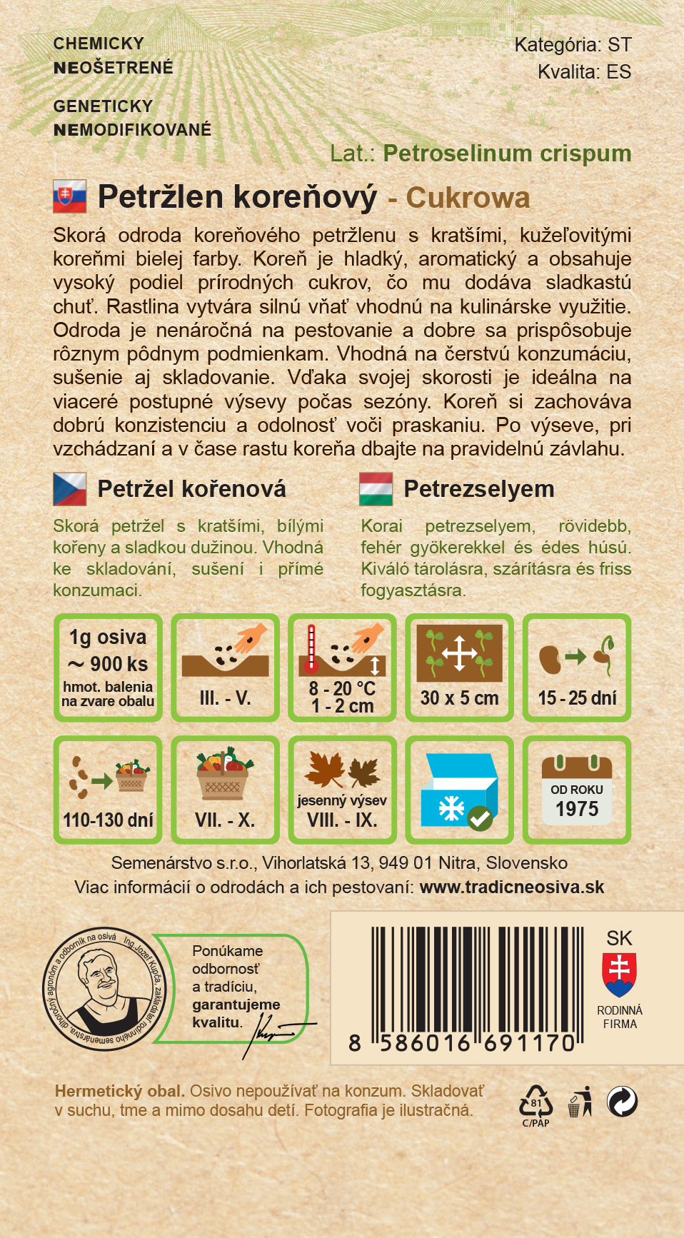 Skorá odroda koreňového petržlenu s kratšími, kužeľovitými koreňmi bielej farby. Koreň je hladký, aromatický a obsahuje vysoký podiel prírodných cukrov, čo mu dodáva sladkastú chuť. Rastlina vytvára silnú vňať vhodnú na kuchynské použitie. Odroda je nenáročná na pestovanie a dobre sa prispôsobuje rôznym pôdnym podmienkam. Vhodná na čerstvú spotrebu, sušenie aj skladovanie. Vďaka svojej skorosti je ideálna na viaceré postupné výsevy počas sezóny. Koreň si zachováva dobrú konzistenciu a je odolný voči praskaniu. Po výseve, počas vzchádzania a rastu koreňa je dôležitá pravidelná závlaha.