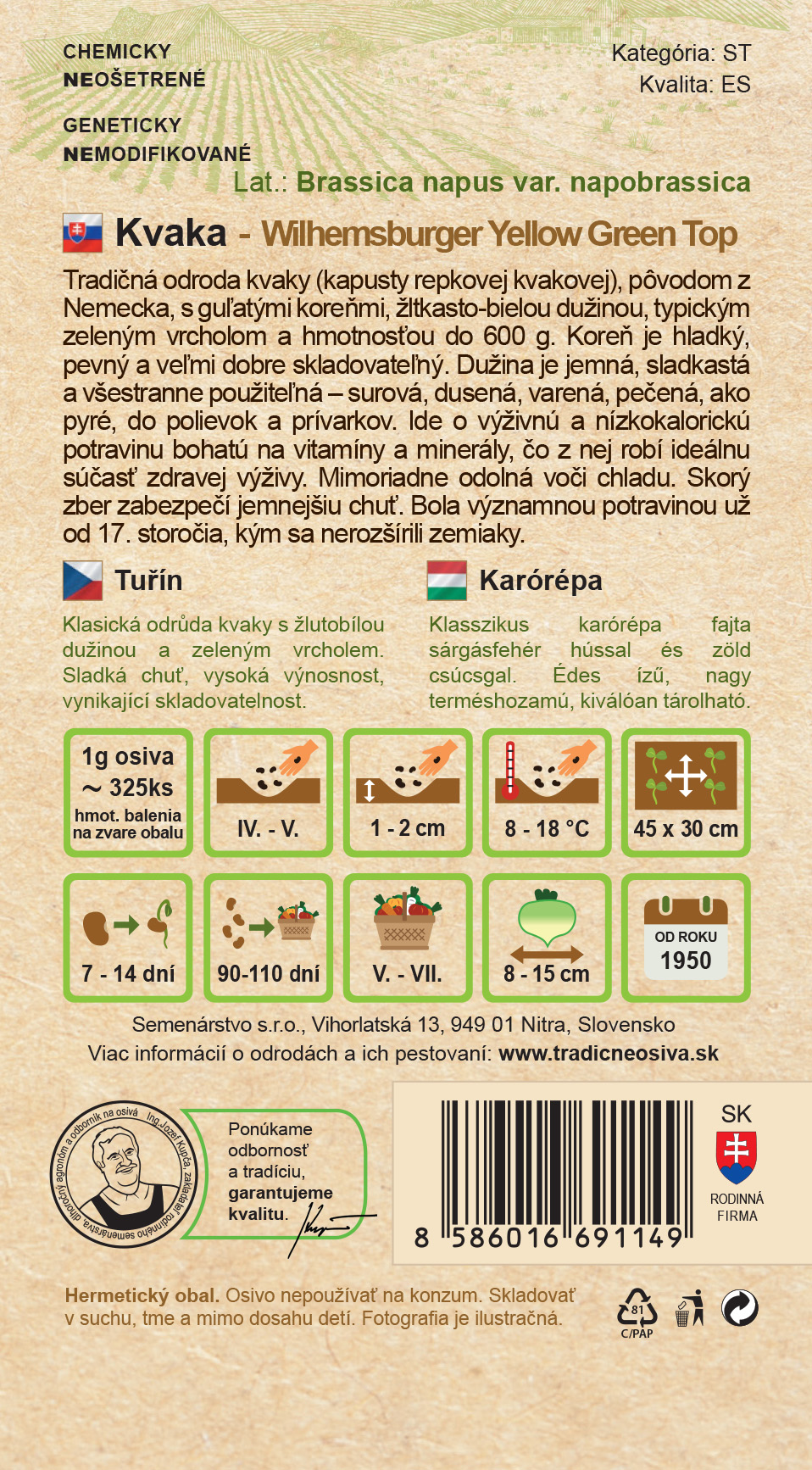 Tradičná odroda Kvaky (Kapusty repkovej kvakovej), pôvodom z Nemecka s guľatými koreňmi so žltkasto-bielou dužinou, typickým zeleným vrcholom a hmotnosťou do 600g. Koreň je hladký, pevný a veľmi dobre skladovateľný. Dužina je jemná, sladkastá a všestranne použiteľná (surová, dusená, varená, pečená, ako pyré, do polievok a prívarkov). Je to výživná a nízkokalorická potravina bohatá na vitamíny a minerály, čo ju robí ideálnou súčasťou zdravej výživy. Mimoriadne odolná voči chladu. Skorý zber zabezpečí jemnejšiu chuť. Bola významnou potravinou už od 17. storočia, kým sa nerozšírili zemiaky
