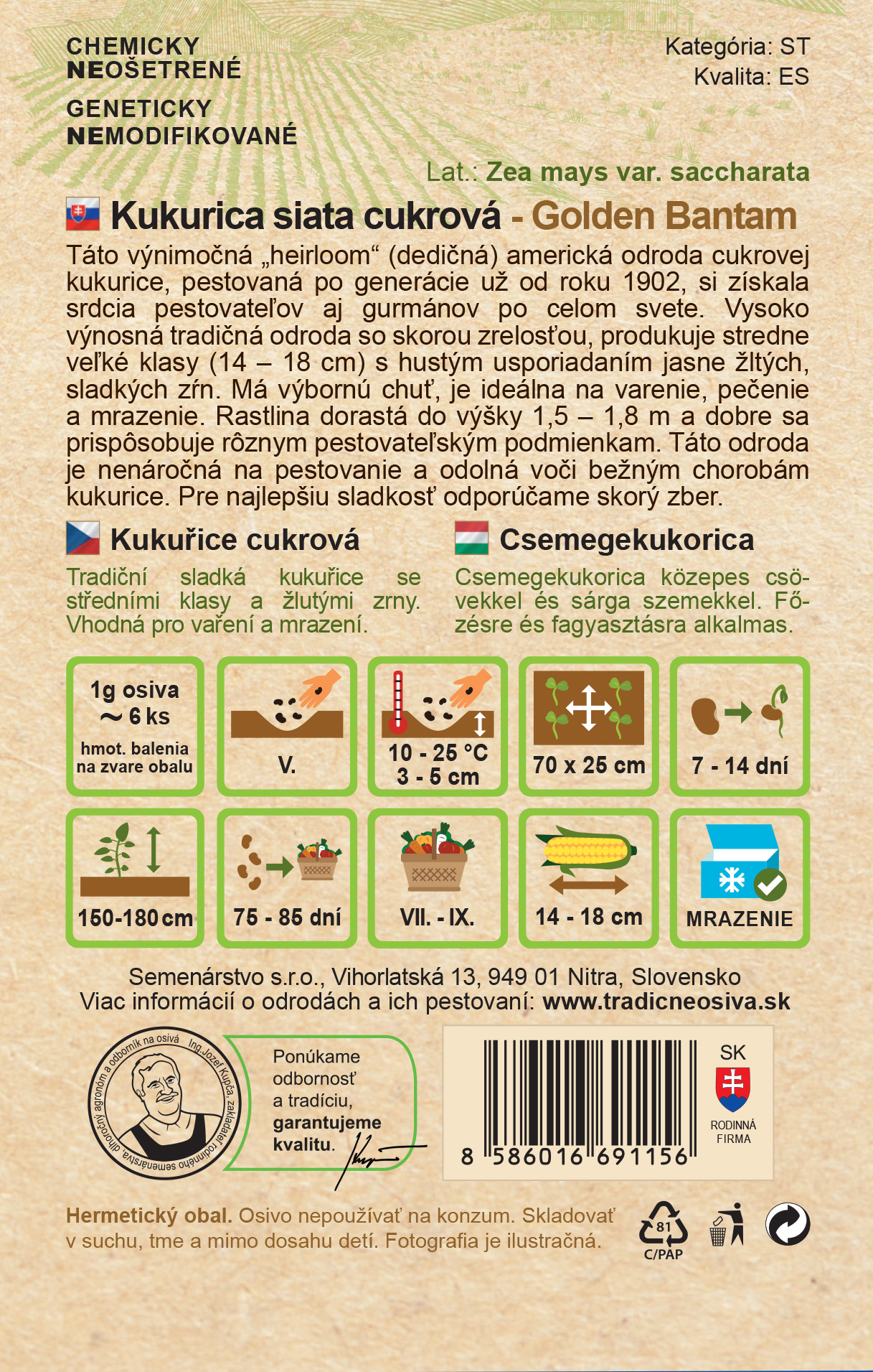 Táto výnimočná „heirloom“ (dedičná) americká odroda cukrovej kukurice, pestovaná po generácie už od roku 1902, si získala srdcia pestovateľov aj gurmánov po celom svete. Vysoko výnosná tradičná odroda so skorou zrelosťou, produkuje stredne veľké klasy (14 – 18 cm) s hustým usporiadaním jasne žltých, sladkých zŕn. Má výbornú chuť, je ideálna na varenie, pečenie a mrazenie. Rastlina dorastá do výšky 1,5 – 1,8 m a dobre sa prispôsobuje rôznym pestovateľským podmienkam. Táto odroda je nenáročná na pestovanie a odolná voči bežným chorobám kukurice. Pre najlepšiu sladkosť odporúčame skorý zber.