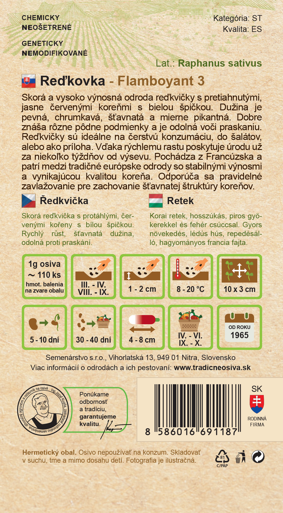 Skorá a vysoko výnosná odroda reďkvičky s pretiahnutými, jasne červenými koreňmi s bielou špičkou. Dužina je pevná, chrumkavá, šťavnatá a mierne pikantná. Dobre znáša rôzne pôdne podmienky a je odolná voči praskaniu. Reďkvičky sú ideálne na čerstvú konzumáciu, do šalátov, alebo ako príloha. Vďaka rýchlemu rastu poskytuje úrodu už za niekoľko týždňov od výsevu. Pochádza z Francúzska a patrí medzi tradičné európske odrody so stabilnými výnosmi a vynikajúcou kvalitou koreňa. Odporúča sa pravidelné zavlažovanie pre zachovanie šťavnatej štruktúry koreňov.